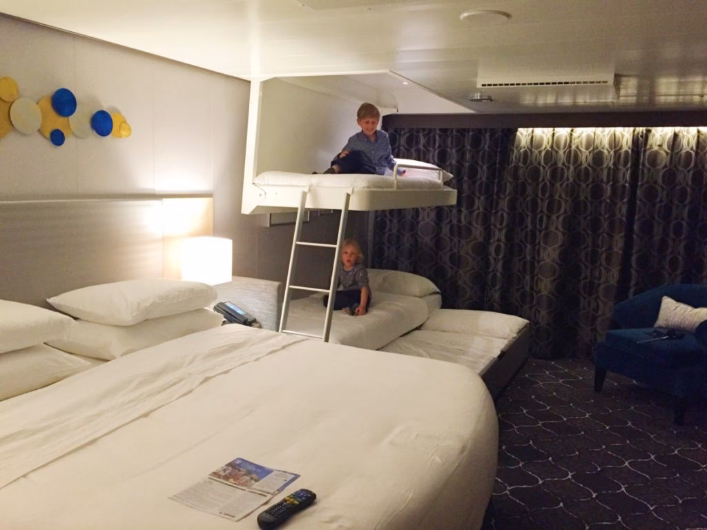 - Family Junior Suites with Balconies: Estas suites están específicamente diseñadas para familias y pueden alojar hasta cinco personas. El sofá aquí es una pieza clave de mobiliario. Se describe como un sofá que puede extraerse para crear una cama doble o, de manera innovadora, una disposición de dos niveles con una cama nido debajo de la cama principal. Esta flexibilidad permite adaptarse a diferentes edades y relaciones entre los niños que comparten la cabina.