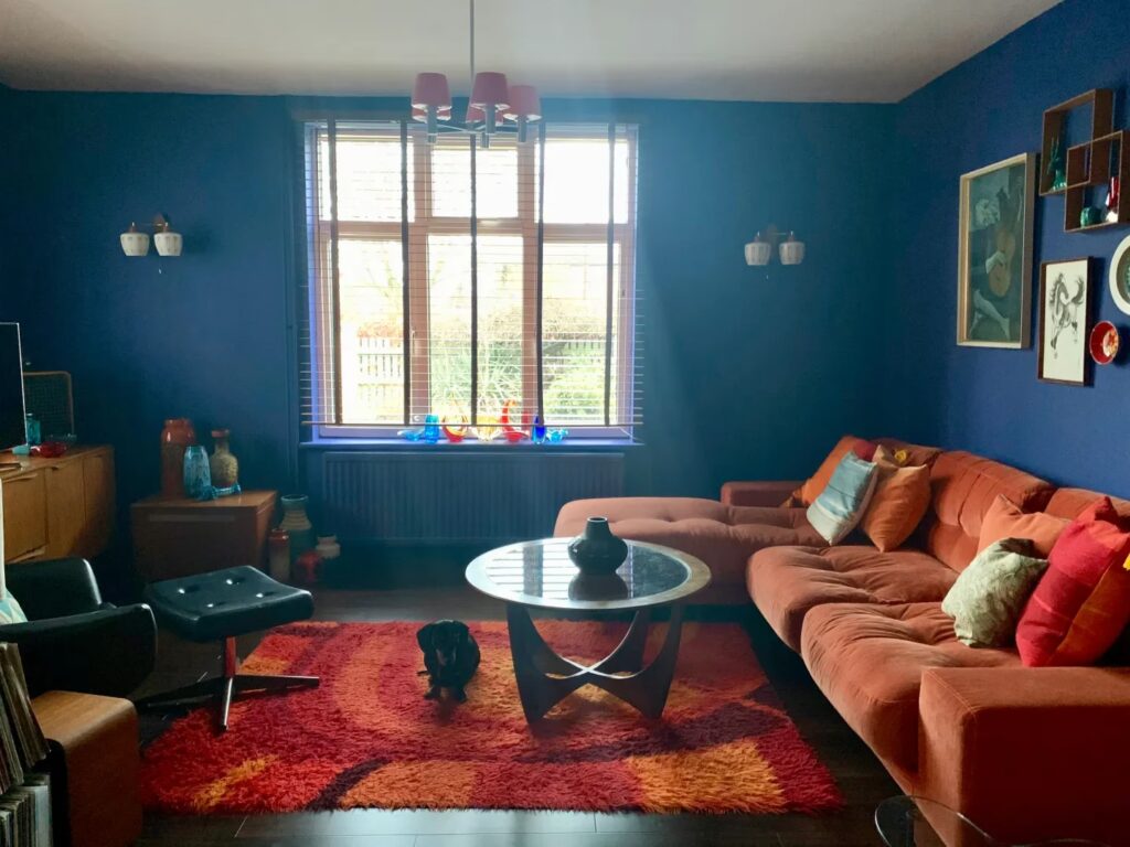 - Naranja o Coral: El naranja es el color complementario directo del azul, lo que significa que se realzan mutuamente. Un sofá naranja o coral frente a una pared azul crea un impacto visual potente y lleno de vida. Esta combinación es audaz y moderna. El coral, al ser una versión más suave del naranja, ofrece un contraste vibrante pero menos intenso, perfecto para un toque tropical o veraniego.