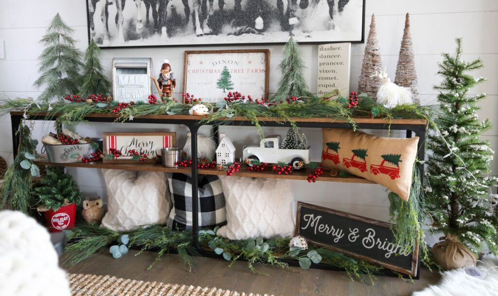 Incorpora libros con temas navideños o marcos con fotos festivas o impresiones de arte navideño. Colócalos junto a velas, adornos pequeños o vegetación para un toque personal y acogedor. Es una forma de añadir capas y altura a tu decoración.