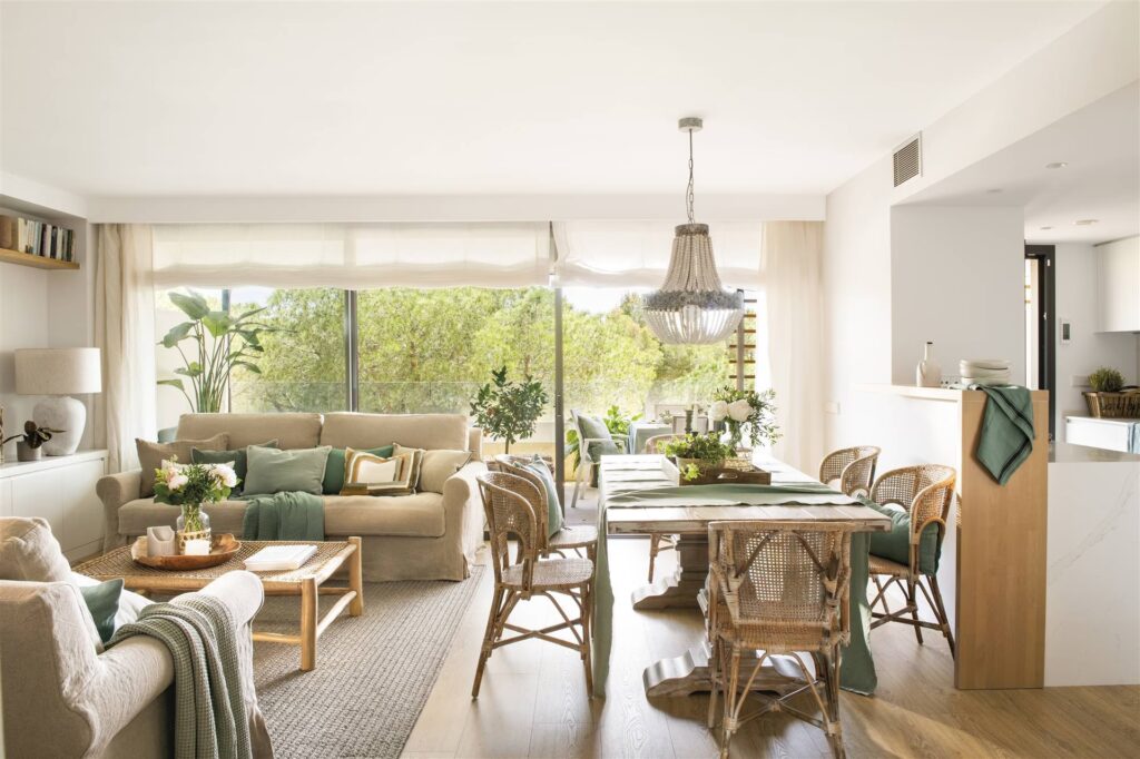 Integrar la sala-comedor con el entorno natural, siempre que sea posible, añade un valor incalculable al espacio. Grandes ventanales que permitan la entrada de luz natural y ofrezcan vistas al exterior (un jardín, un balcón con plantas, o incluso el paisaje urbano) crean una sensación de amplitud y serenidad. La luz natural es esencial para hacer que cualquier espacio se sienta más grande y acogedor. Utilizar una paleta de colores inspirada en la naturaleza y materiales naturales como la madera, la piedra o las fibras vegetales puede reforzar esta conexión, creando un ambiente relajante y armonioso.