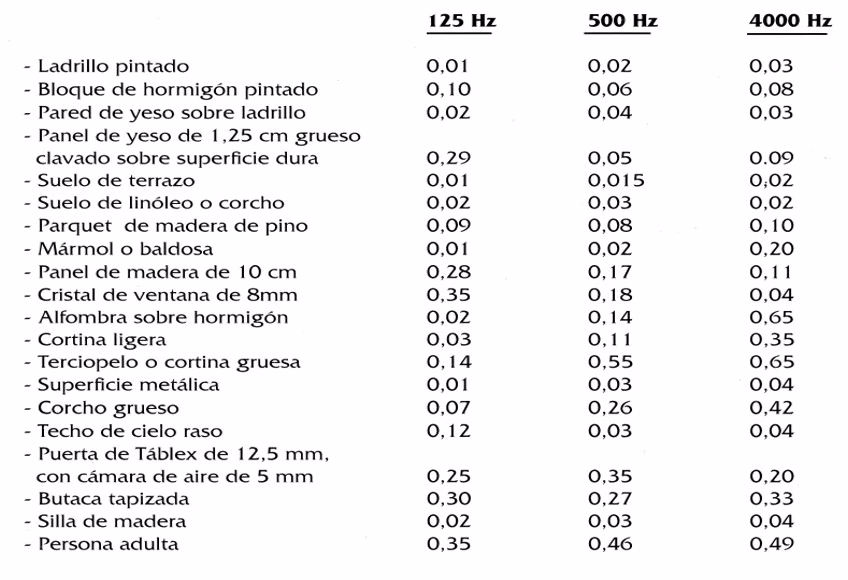 Un coeficiente de 1 significa que el material es capaz de absorber completamente la energía sonora que incide sobre él, sin reflejarla. Un coeficiente de 0 significa que refleja toda la energía sonora.