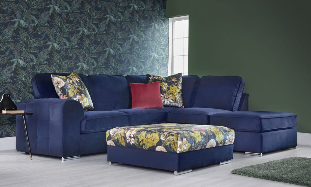 Si te sientes aventurero, un sofá con un patrón audaz puede ser una pieza central fantástica. Considera la escala del patrón en relación con el tamaño del sofá y la habitación. Los patrones grandes suelen funcionar bien en sofás grandes, mientras que los patrones más pequeños pueden ser mejores para piezas de acento o cojines. Para evitar que la habitación se sienta recargada, combina un sofá estampado con cojines o sillones en telas lisas que recojan los colores del patrón. Otra técnica es mezclar diferentes patrones, pero manteniéndolos dentro de una paleta de colores similar o usando un patrón dominante y otros más sutiles.