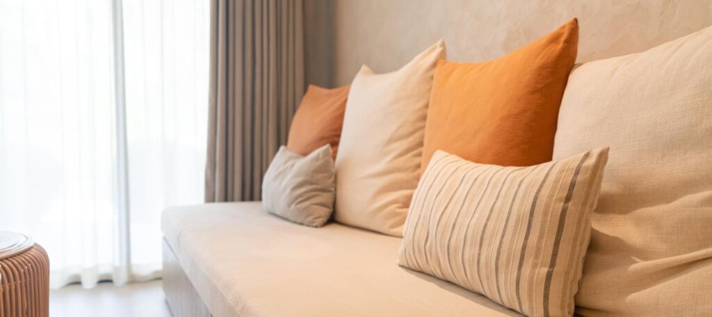 | Solo Almohadas Decorativas | Informal, colorido | Bueno para sentarse corto tiempo | Requiere muchas almohadas de relleno firme |