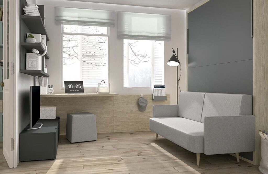 Espacios multifuncionales donde el área de trabajo necesita desaparecer cuando no está en uso, como salas de estar o dormitorios pequeños. Útiles para pagar facturas, escribir cartas o usar un portátil ocasionalmente.