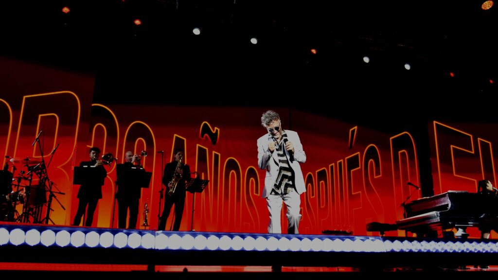 Tras un breve intervalo, la noche explotó con la energía de Circo Beat. Fito regresó al escenario con un cambio de vestuario y la actitud festiva que caracteriza a este disco de 1994. La energía cambió drásticamente, invitando al baile y a un coro masivo que llenó el recinto. Himnos como “Mariposa Tecknicolor” desataron la euforia general, mientras que otras canciones emblemáticas como “Tema de Piluso” tocaron fibras nostálgicas. El show incluyó otros grandes éxitos de estos álbumes y de su carrera, como “Cuervos en Casa”, “Normal 1”, “Las tardes del sol”, “She’s Mine” y “Si Disney despertase”.