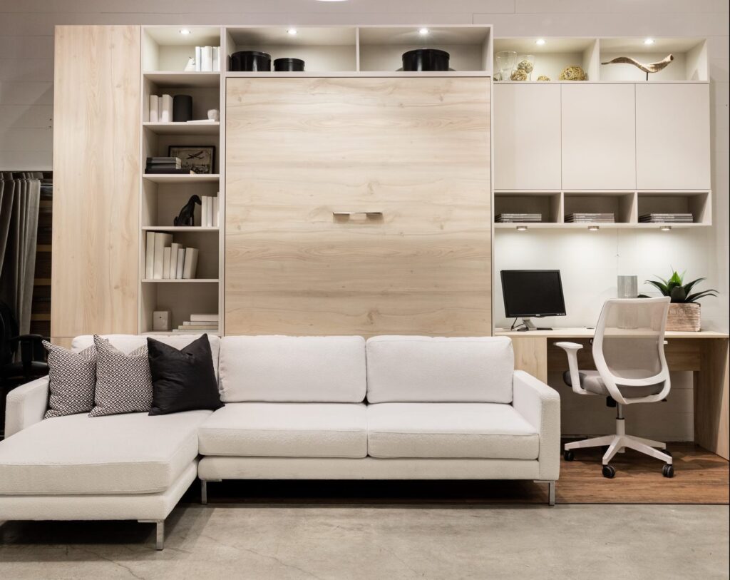 Una tercera opción que combina funcionalidad de estar y dormir es la cama sofá abatible, a veces llamada MurphySofa. Estas unidades integran un sofá con una cama abatible, creando una solución muy eficiente para espacios multifuncionales como salas de estar que también sirven como habitaciones de invitados o estudios pequeños. El sofá se pliega o se retrae de alguna manera para permitir que la cama se despliegue sobre él o detrás de él.