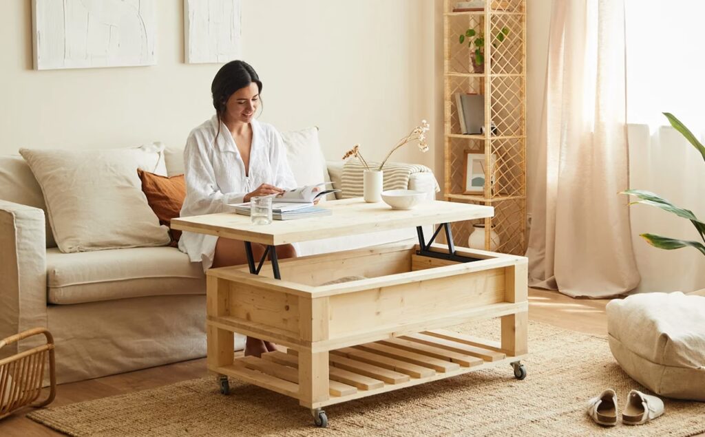 - Superficies Elevables: Estas mesas no solo ofrecen almacenamiento interno, sino que su tapa se eleva y avanza, creando una superficie de trabajo o comedor más cómoda a la altura del sofá.