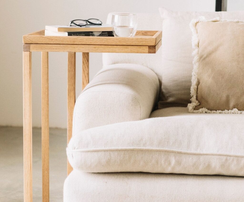 - Mesas en C (C-tables): Estas mesas tienen una base en forma de C que permite que la parte superior se deslice sobre el asiento del sofá. Son muy versátiles, especialmente para comer o trabajar con un portátil desde el sofá. La altura aquí es crucial para que la superficie quede cómodamente sobre tus piernas.