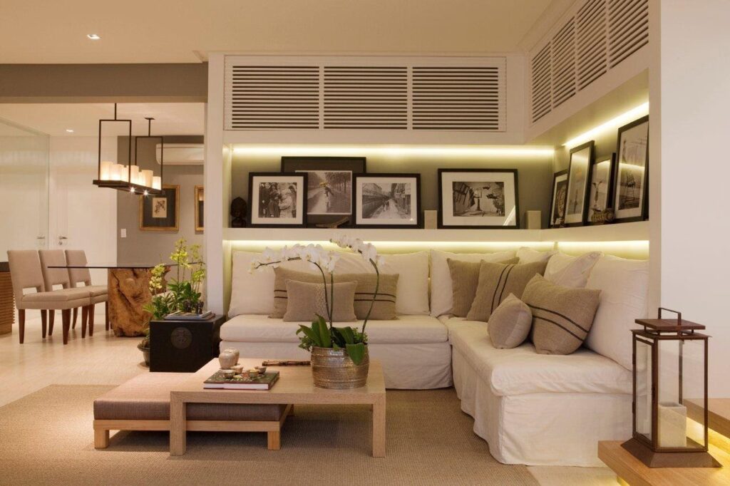 Las prateleiras son una solución decorativa y funcional excelente para la pared detrás del sofá. Ofrecen un espacio para exhibir objetos decorativos, libros, plantas pequeñas, portarretratos o incluso mini cuadros. Ayudan a mantener el orden y añaden profundidad y dimensión a la pared.